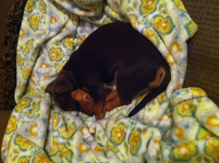 My mom and I came over July 27th to look at the last Dachshund that you had left. He was so cute and active and yet he loved to cuddle and be held. It didn’t take very long to fall in love with him. He did great on the way home. Mom sat with him and talked to him and he was very content to stay in his crate with the door open playing with his new toys. He went to the vet the next week and proved to be healthy except for a yeast infection in both ears and that has cleared nicely with several doses of antibiotic drops. The only other problem was his left rear foot that had only two toes. The vet explained that he had only one weight-bearing toe instead of two, but that she didn’t think he would have any problems with that. He went back to the vet August 17 and was neutered. That day he was a pitiful little guy, but the next day he was back running around like nothing ever happened.