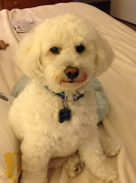 This is Sparky MCPooch who we adopted from you two years ago. We are totally in love with him. What a snuggle-bug he is. He is healthy and happy. Thank you!